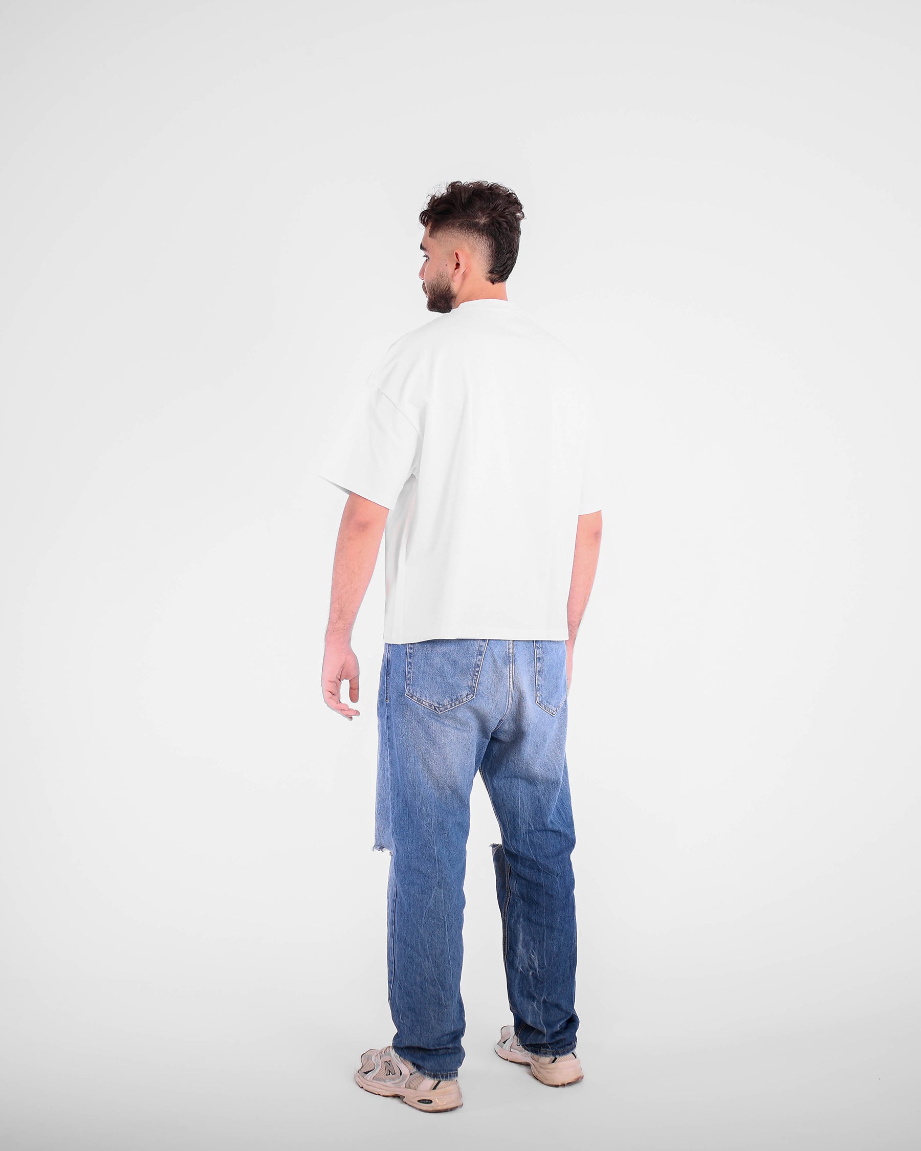 The Blackout Kiss Tee is exhibited on a male subject with stature of 188 cm wearing size Medium, complemented by a female subject of 165 cm height in size Small .